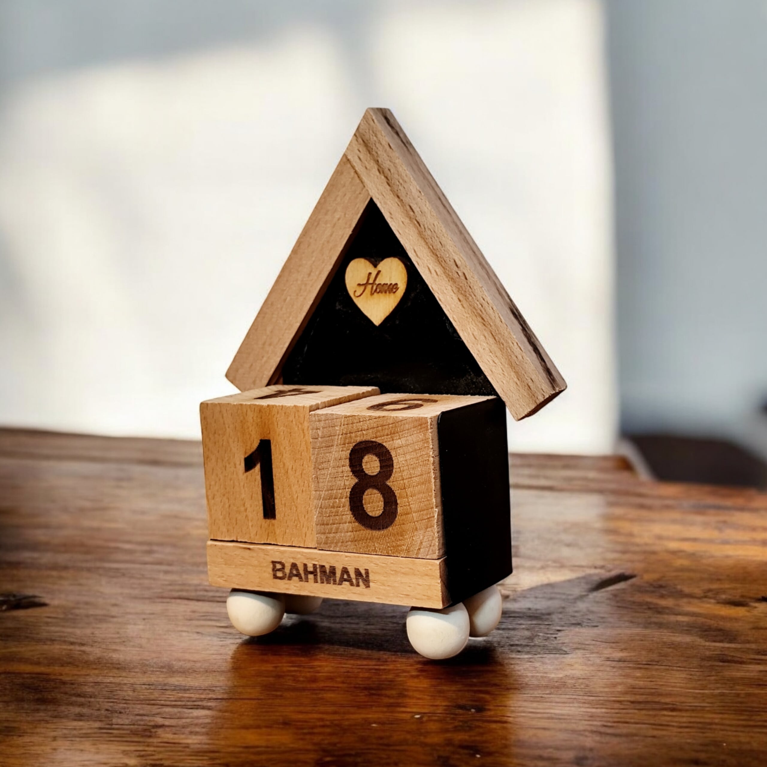 این محصول دارای شش قطعه چوبی و پایه فلزی بوده که روی هر وجه آنها ماه ها و شماره روزهای ماه درج شده و به راحتی برای هرسال قابل استفاده است.