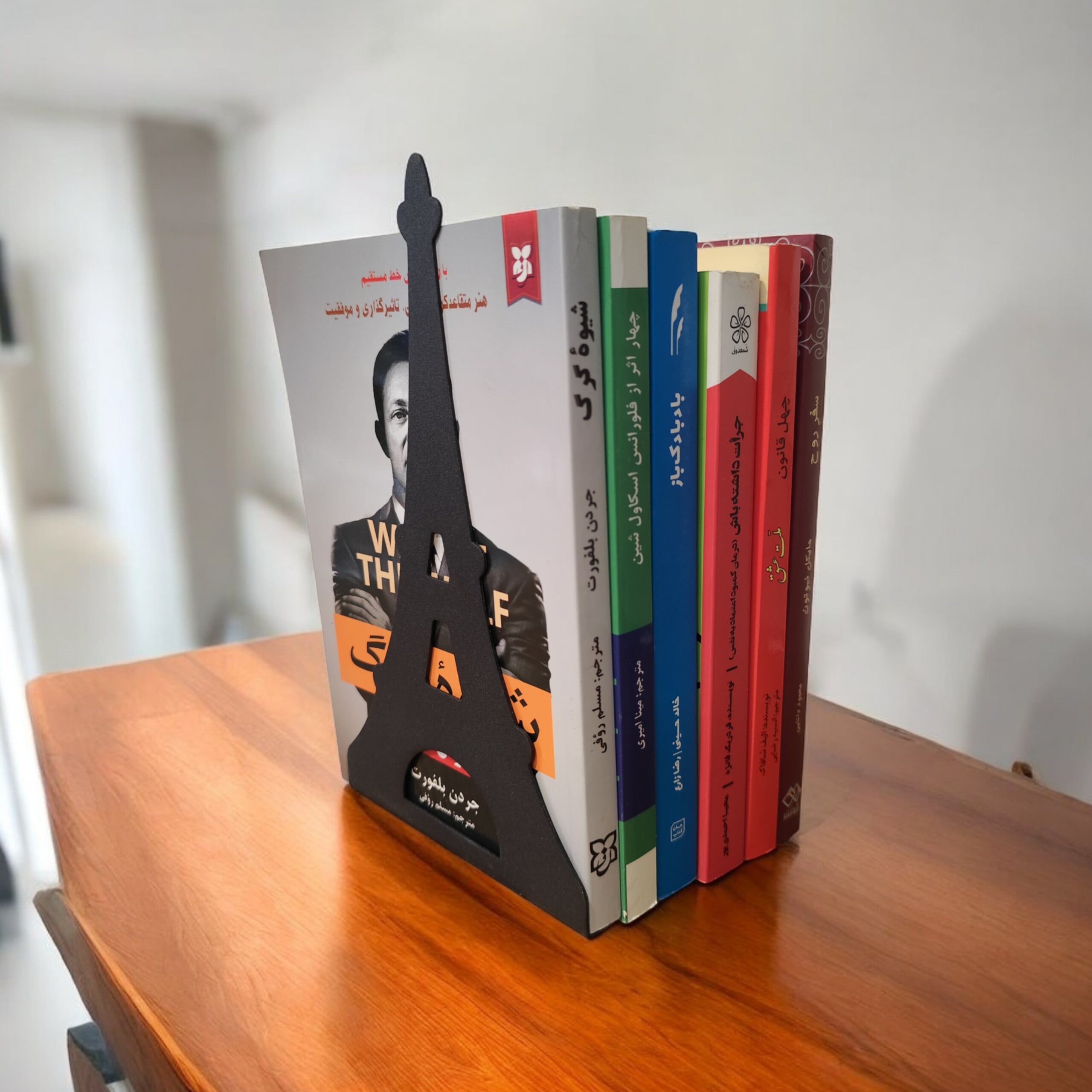 استند و نگهدارنده کتاب طرح ایفل ، را روی میز،کنسول و یا داخل کتاب خانه قرار می دهیم . سپس کتاب ها را از بصورت عمودی روی بدنه پایین نگهدارنده و غشگیر کتاب طرح ایفل میگذاریم به آن تکیه میدهیم.به همین راحتی شما به کتاب هاتون نظم دادید. از همه مهم تر یک طرح زیبا،خلاقانه و دکوری به میز،کنسول و یا کتابخانه تون اضافه کردید.
